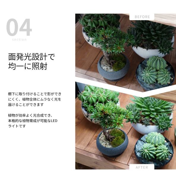 ○均一に照射する面発光設計。LEDの点光源ではなく、面全体で発光するため、光ムラを防ぎ、植物の成長を促進。