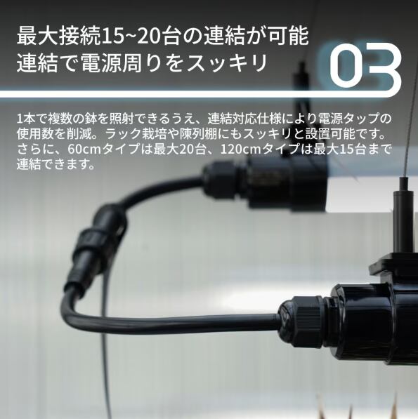 さらに、連結対応仕様により電源タップの数も削減でき、ラック栽培や陳列棚にもスッキリと設置ができます。