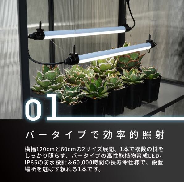 1本で複数の株をしっかり照らす、バータイプの高性能植物育成LED。IP65の防水設計&60,000時間の長寿命仕様で、設置 場所を選ばず頼れる1本です。