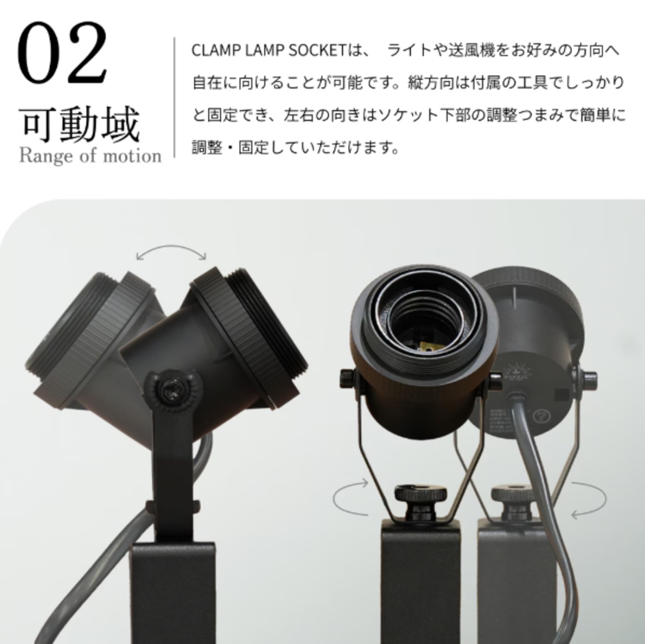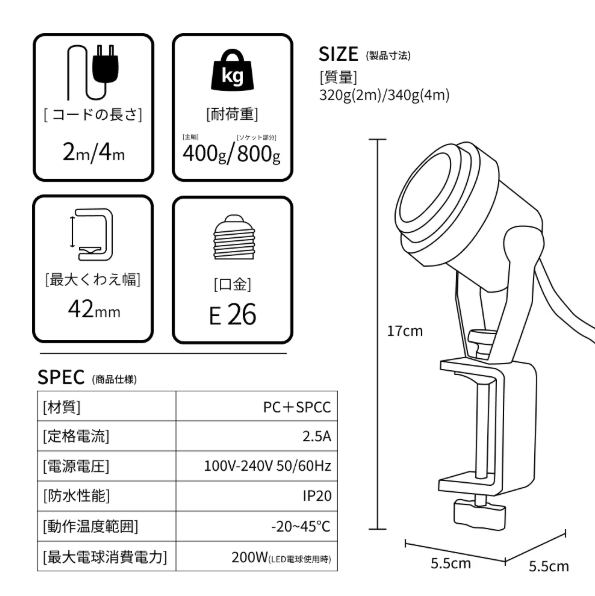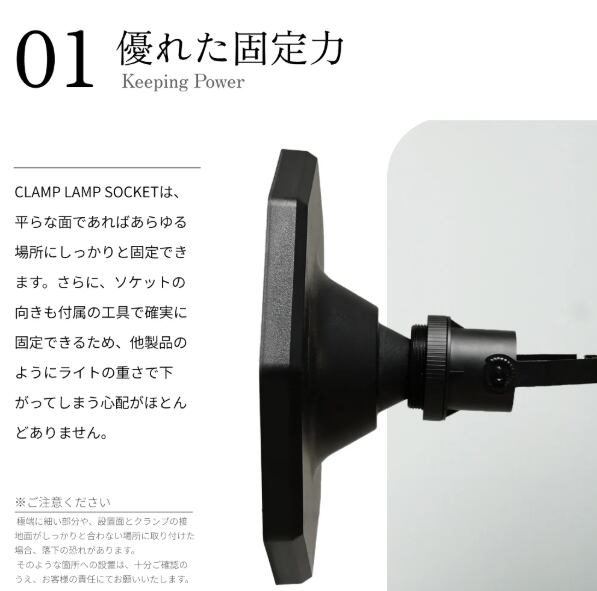 商品説明:お好みの場所にライトを設置できる、クランプ式のソケットです。